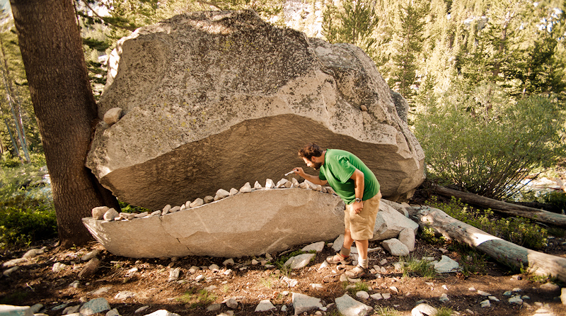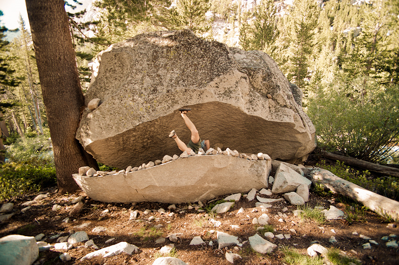 We had planned to hike all the way down to Big Pete Meadow, but about a half-mile or so before the meadow we spied something off the trail. Grinning welcomely, or menacingly depending on how you looked at it, was a giant rock monster. Some very clever hikers before us had turned a giant boulder split horizontally into a work of art. Lining the bottom of the crack with small pointy rocks for teeth, and placing two rocks in nooks above the crack for eyes, they created a surprisingly anatomically correct monster sculpture.
