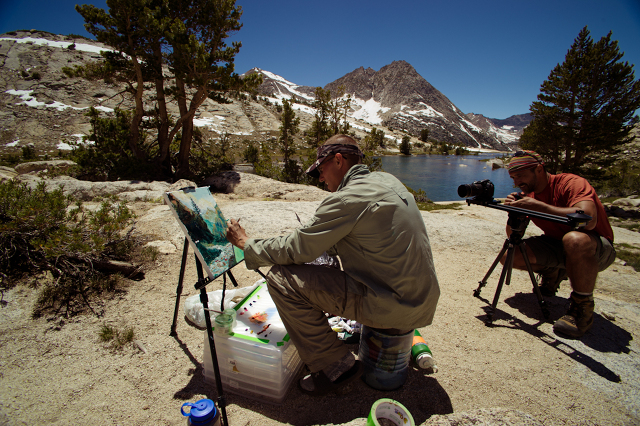 We thoroughly experienced our subject, the Muir Trail, as we painted it, by carrying our artwork over passes, across rivers, through clouds, and up mountaintops. It nearly broke our backs.