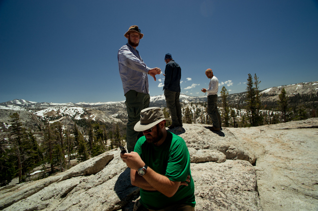 The night before, we had come into camp in the dark after a really hard day trudging through snow over both Donahue and Thousand Islands passes. Then most of that morning, we had navigated some really treacherous snow banks around Emerald and Garnet lakes. The last kicker was an exhausting 300-foot climb straight up through the snow to get out of Garnet Lake’s basin. Once we finally reached the top of the ridge and could see the trail ahead, it was snow free. This was a huge relief because we were all pretty tired.