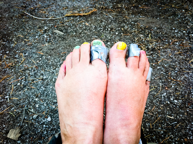 First, it was a sixth toe – a big blister on the outside of my left big toe. Then a blister on the outside of my right pinkie, then the inside, then the 2nd toe on the right foot nail looked like it might go (but thankfully stayed on until after the trail was over,) then the right instep, the left heel, left pinkie toe with skin peeling completely off the tip and then new blisters appearing where the skin came off. Right in-sole blister, and a blood blister. Then of course the left ankle started giving real trouble, but that was only 3 days from the end. (You can handle anything for three days apparently.)